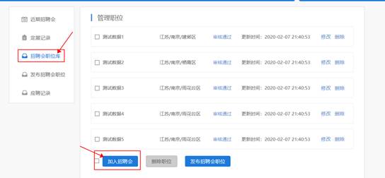 2. 企业通过后台中心“网络招聘会”栏目——点击发布招聘会职位(等待审核)——审核通过后,将“招聘会职位库”中的职位加入到“陇南师范高等专科公司2021年冬季高校毕业生网络视频双选会”,职位将在网络招聘大厅中进行展示。