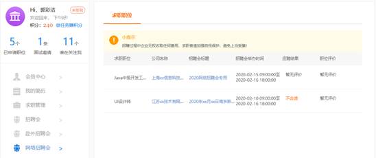 2. 个人用户在个人会员中心-网络招聘会页面查看应聘记录。
