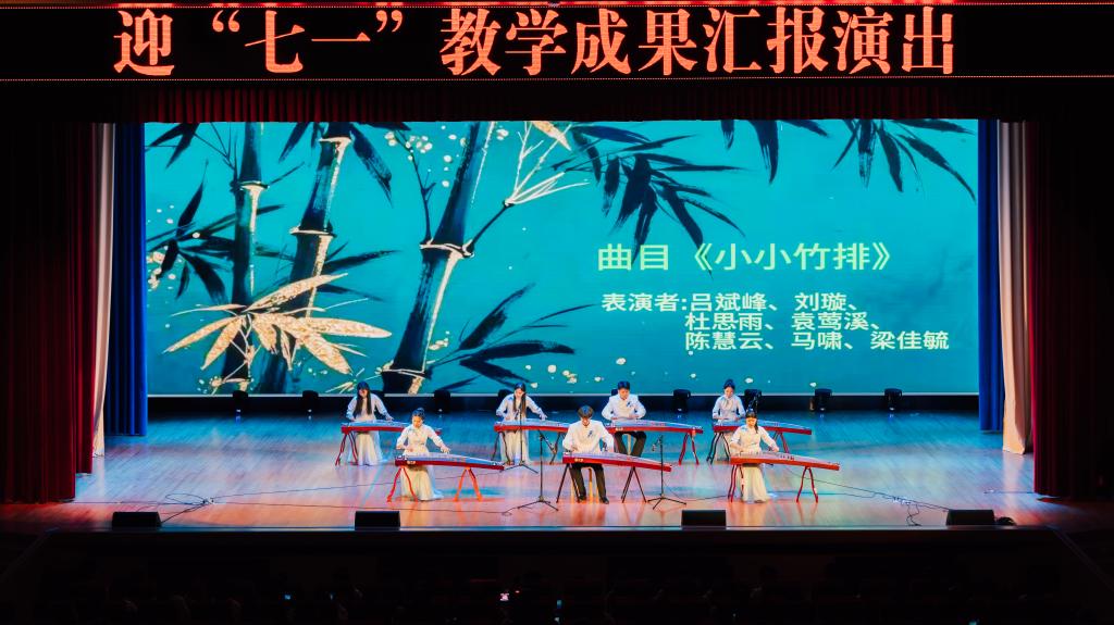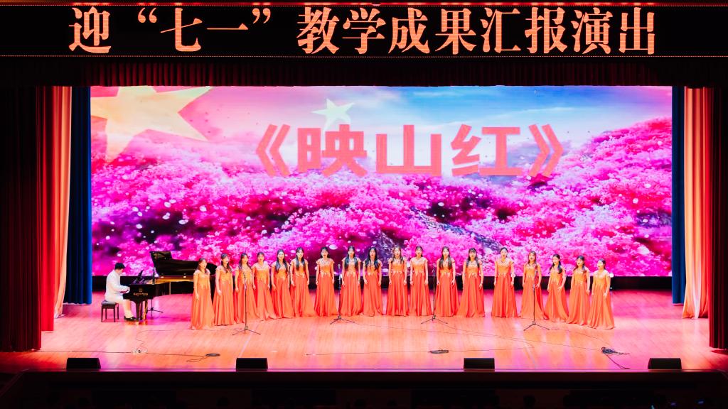 第二篇章以钢琴独奏《采茶扑蝶》、舞蹈《能不忆江南》展现改革开放以来的时代风貌;第三篇章通过蒙古舞《走在阳光下》、竹笛合奏《沂河欢歌》等节目,抒写民族团结与乡村振兴的壮美画卷。压轴节目《领航》与全场合唱《没有共产党就没有新中国》将晚会推向高潮,彰显师生永远跟党走的坚定信念。