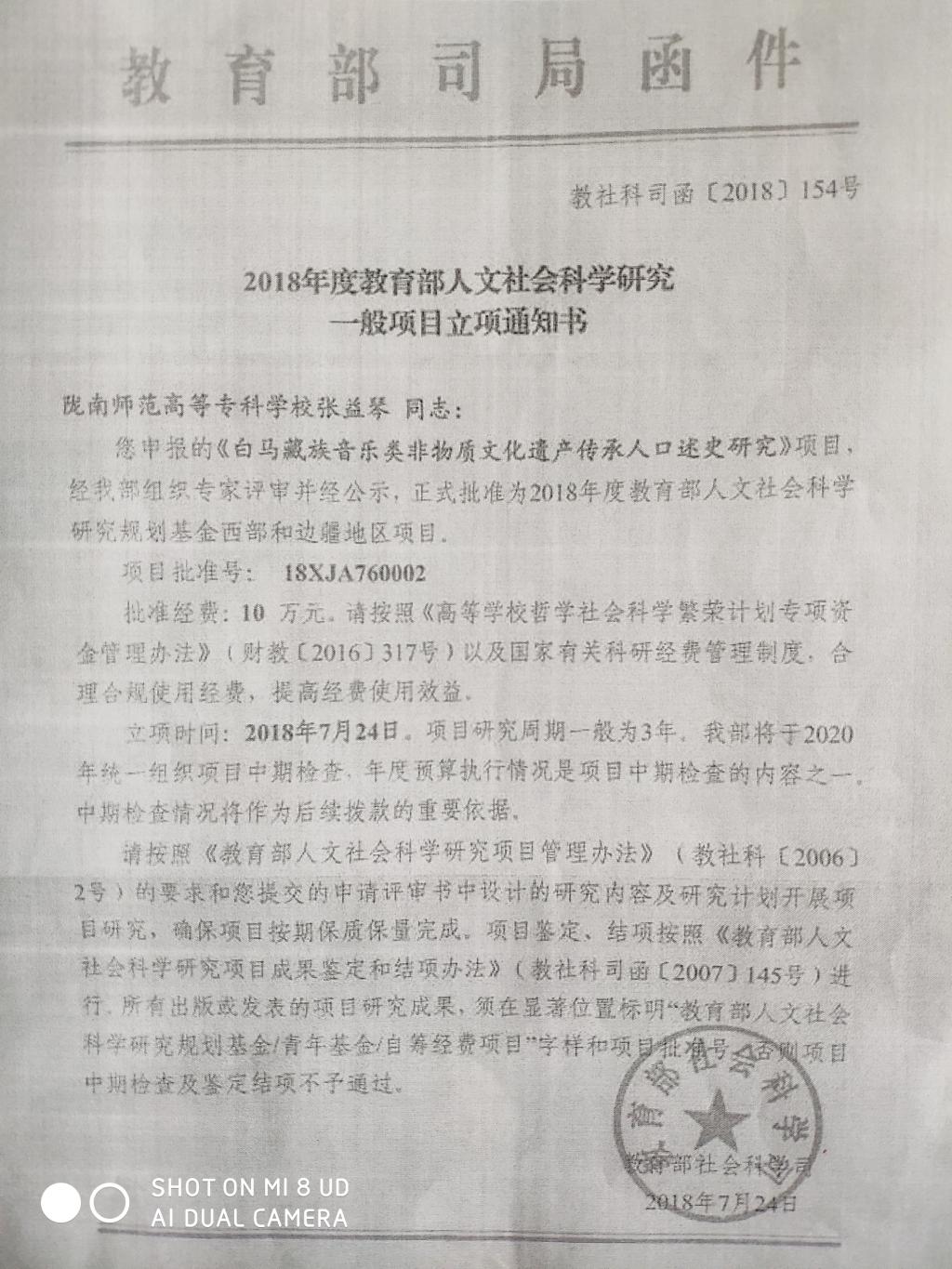 6月28日,2018年度教育部人文社会科学研究西部和边疆地区项目评审结果公示,公司英国365集团教授张益琴申报的《白马藏族音乐类非物质文化遗产传承人口述史研究》获得规划基金项目立项,这是公司首次获得教育部科研项目。该项目获批资助10万元,2021年结项。