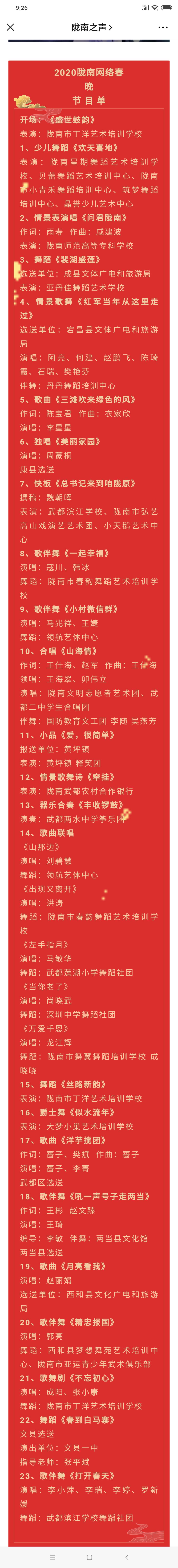 梦圆新时代,幸福新陇南。由中共陇南市委宣传部、陇南市文化广电和旅游局主办,陇南广播电视台承办,各县区委宣传部、文体广旅局、融媒体中心协办的2020年陇南网络春节联欢晚会2020年1月19日在陇南礼堂演出。