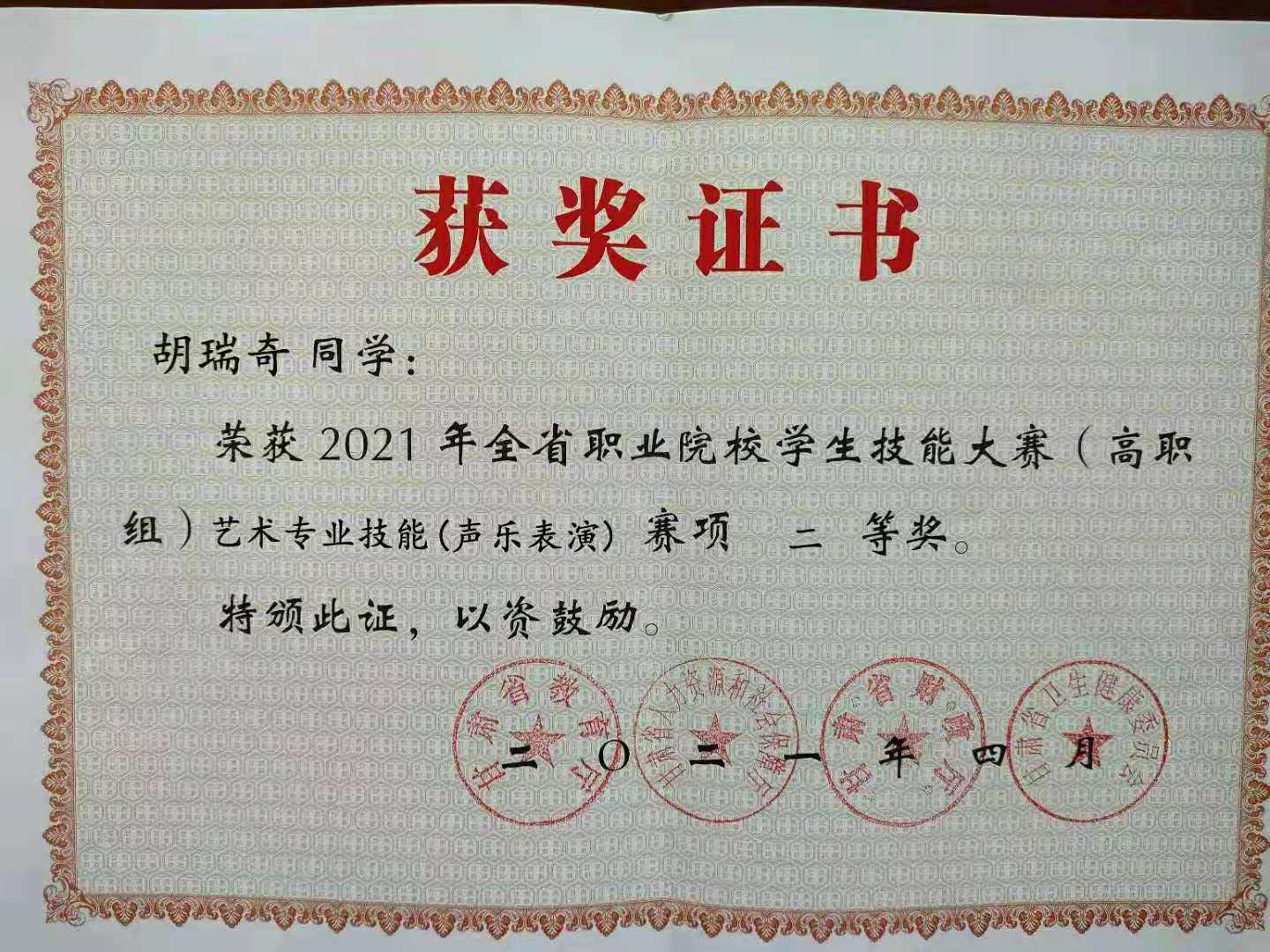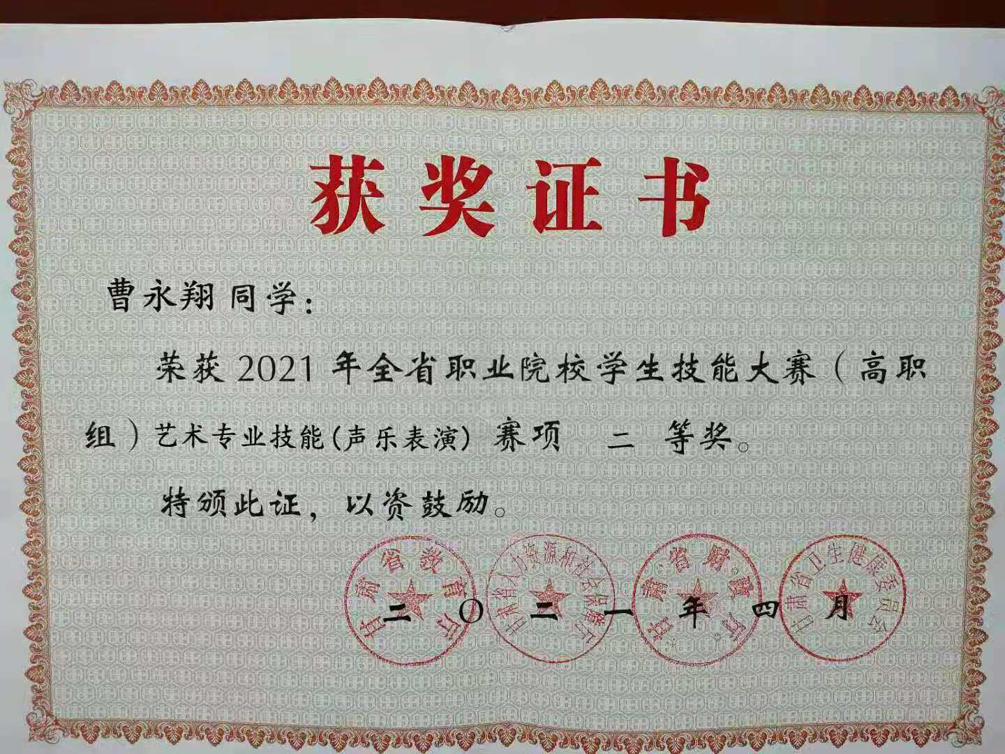4月19—21日,甘肃省高等职业院校职业技能竞赛声乐表演项目在兰州职业技术公司进行,公司员工曹永翔、张保利、胡瑞琦三名员工在周新美经理带领下,与指导教师杨欢、艺术指导刘光华一行赴兰州职业技术公司参加了声乐表演项目竞赛,经过三轮激烈的竞争,最终三名选手全部荣获二等奖。